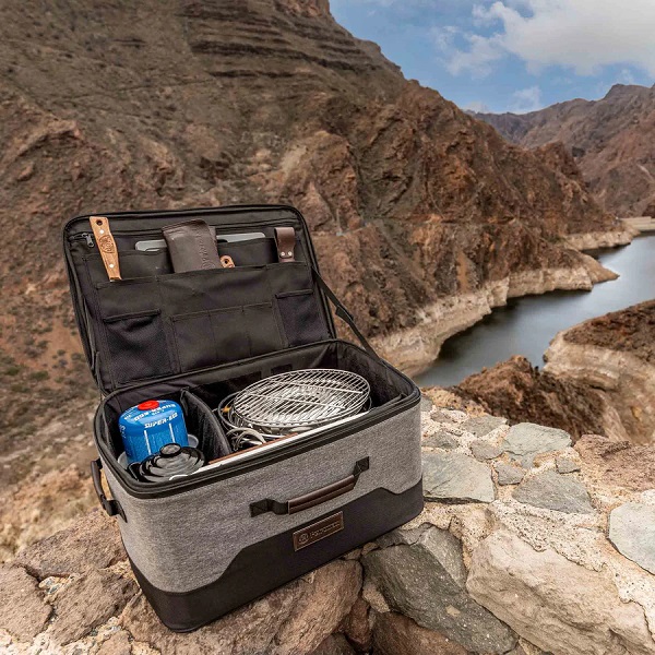 As divisórias ajustáveis ​​individualmente oferecem a máxima flexibilidade, permitindo-lhe transportar com segurança o seu equipamento, seja o grelhador a gás Atago ou o conjunto de panelas Dimego – ambos cabem facilmente. Além disso, as alças laterais permitem que você leve sua aventura culinária para onde quer que vá.