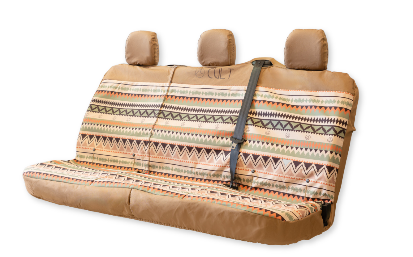 A capa de assento tripla da Cult foi concebida para ser prática e fácil de usar. Inclui fechos de velcro para que os cintos de segurança se movam livremente e aberturas para as fivelas dos cintos. Resistente, fácil de limpar e perfeita para a vanlife e para as aventuras do dia a dia.