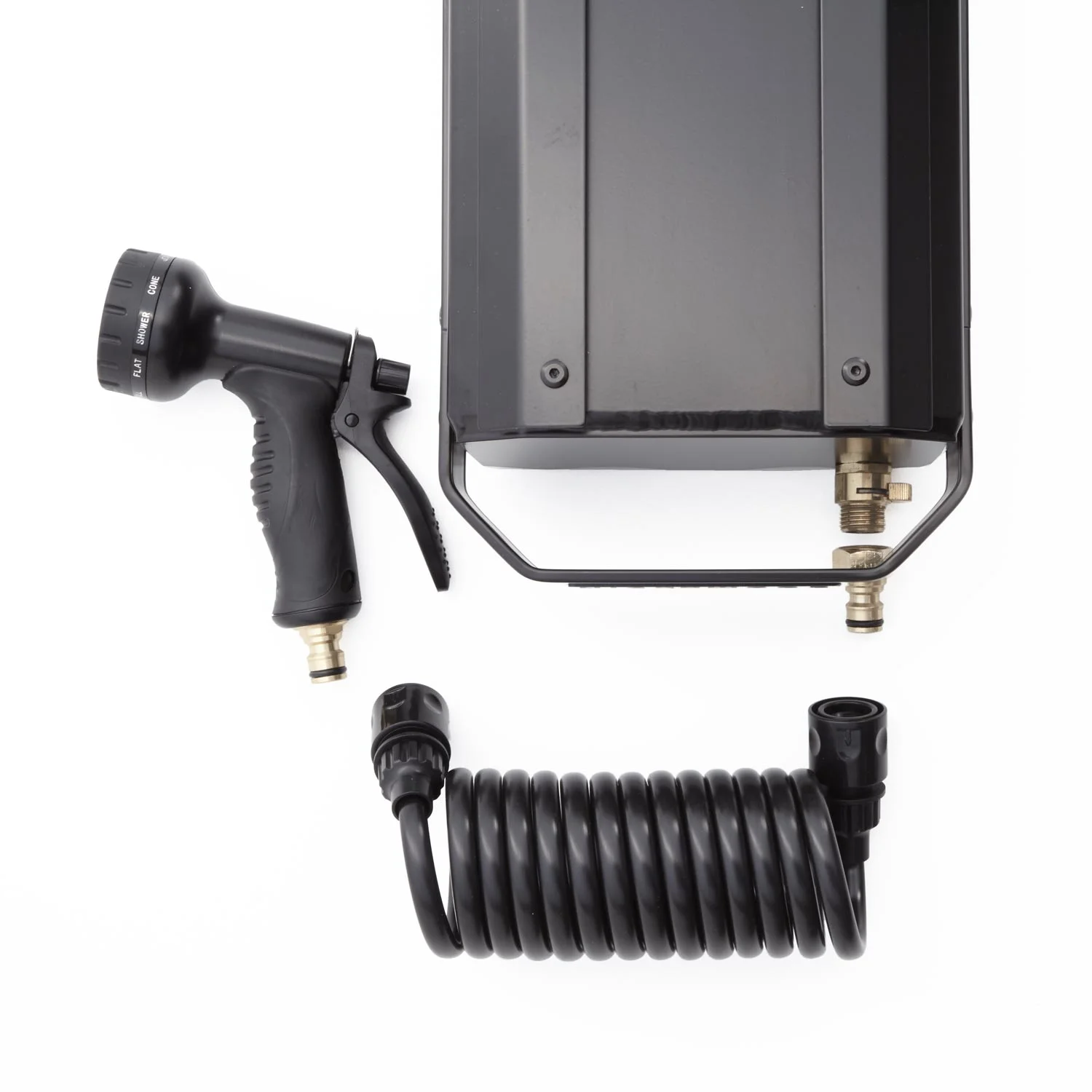 O nosso DUCHE EXTERIOR oferece-lhe a máxima flexibilidade e conforto na sua próxima aventura. O depósito de água em alumínio de alta qualidade está disponível em três tamanhos — 16, 26 e 36 litros — e é perfeito para tomar banho, lavar a loiça e fazer limpezas em viagem, graças à sua função de alta sobrepressão até 4,5 bar.