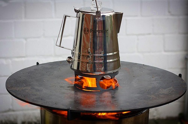 The cooking support in the centre of the plate is a stable stand for pots, kettles and percolators. Use the heat from the Pyron to prepare entire dishes for you and your friends on the 59.6 cm wide plate. Thanks to the large openings, the unrestricted ventilation will boost the fire even with cookware placed on the cooking support. The opening in the centre of the support also allows you to safely add wood during use.