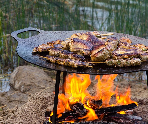 With the three pillars, the griddle and fire bowl stands steadily over an open fire. Its centre becomes hotter than the edge, thus you can keep warm steaks, bakery produce and so on, while vegetables are still frying in the middle. Before using it for the first time, the griddle must be seasoned, so that a patina forms at each use, making it naturally non-stick. Once it has been seasoned, the griddle becomes hot very quickly and you can begin grilling right away.