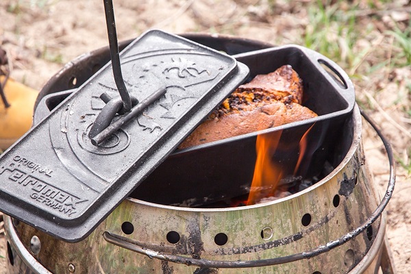 Made of cast iron, the loaf pan distributes and stores heat outstandingly. No matter whether you use it over an open fire or whether you place briquettes on the lid: The created all round warmth is impressive in the oven at home and when cooking outdoors. Thanks to the so-called seasoned finish, the loaf pan can be used right away.