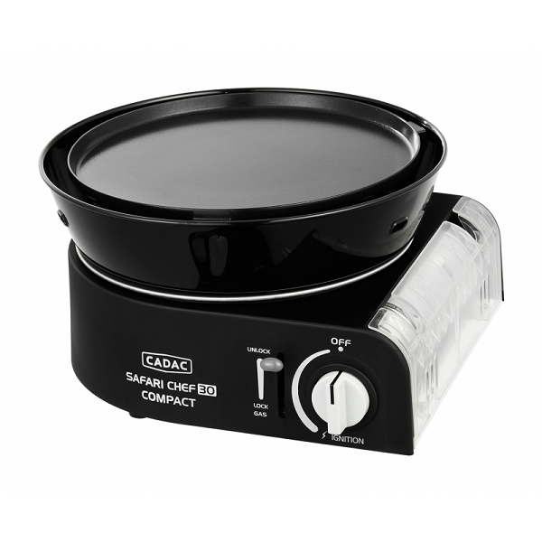 The NEW Safari Chef 30 Compact is an ultra compact & lightweight gas barbecue. It works directly of a 227gr gas cartridge. Simply place it in the appliance, tighten with the handle and start cooking or grilling. The perfect appliance for outdoor activities and camping holidays.